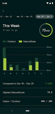- Set customized weekly NatureDose targets (for example 120 minutes a week)