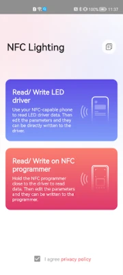 NFC Lighting is an APP for programming LED drivers by NFC , which allows users to change output current of LED drivers with just one click. NFC programming replaces the labor-intensive and time-consuming current setting method of traditional LED drivers. With NFC Lighting, users can precisely adjust the output current down to 1mA. Since the LED drivers do not need to be powered for NFC programming, output current and parameters of mass drivers can be fast configured. So it greatly reduces time and costs of installation and commissioning.