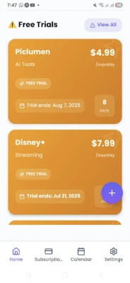 Free Trial Alerts: Set reminders for trial periods so you can cancel before being charged. Studies show nearly 50% of people forget to cancel trials – you won’t with timely notifications.